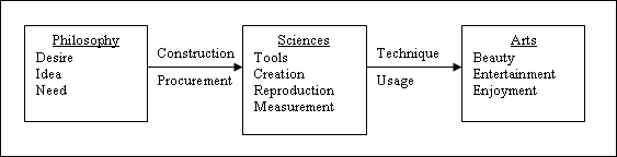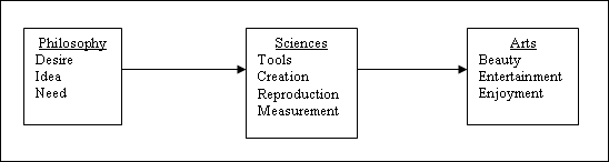 At first, these lead me to develop a simple structure that starts at the beginning of a development process. What I saw was all projects, historically or Society-wise beginning with an idea. "Wouldn’t it be nice if we had ...." To me this seemed to be where the Philosophy fell. This was the desire and ideas formed by a culture to develop an idea into something useful. This was then followed by the Sciences or the creation of the tools necessary to create with. This was the "technologies" that Kingdom describes. The use of those tools to create beauty was the creation of "art forms". Now I had a linear progression through all three areas described by Kingdom and Arts and Sciences was a title for these areas.